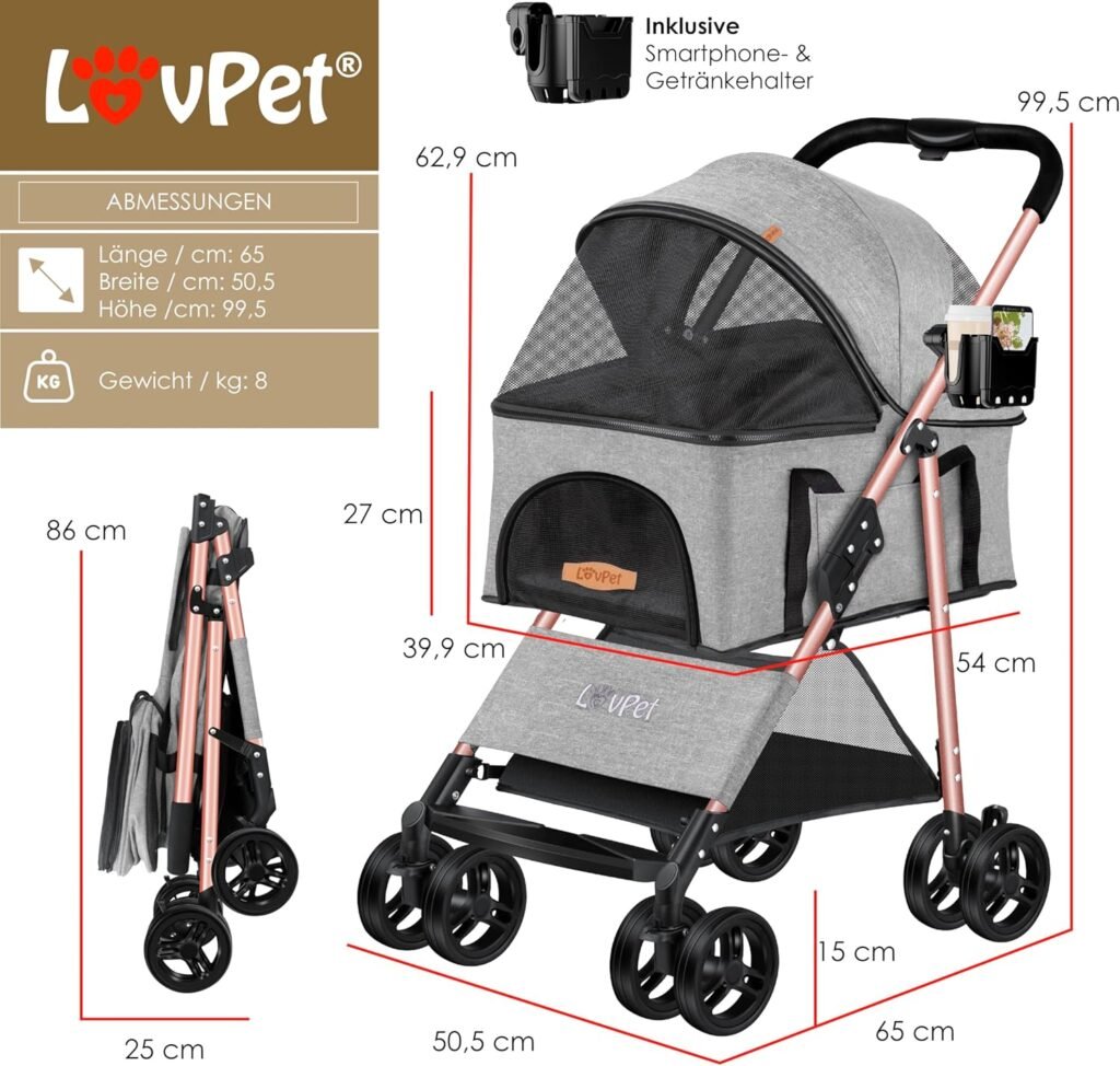 En cuanto a las dimensiones, el carro Lovpet® es compacto y tiene la ventaja de poder ser plegado, lo que facilita su almacenamiento cuando no está en uso. Las dimensiones plegadas son ideales para ser guardadas en espacios reducidos como baúles de automóvil o armarios. Su peso liviano facilita su manejo, permitiendo a los propietarios de mascotas llevarlo consigo sin inconvenientes.