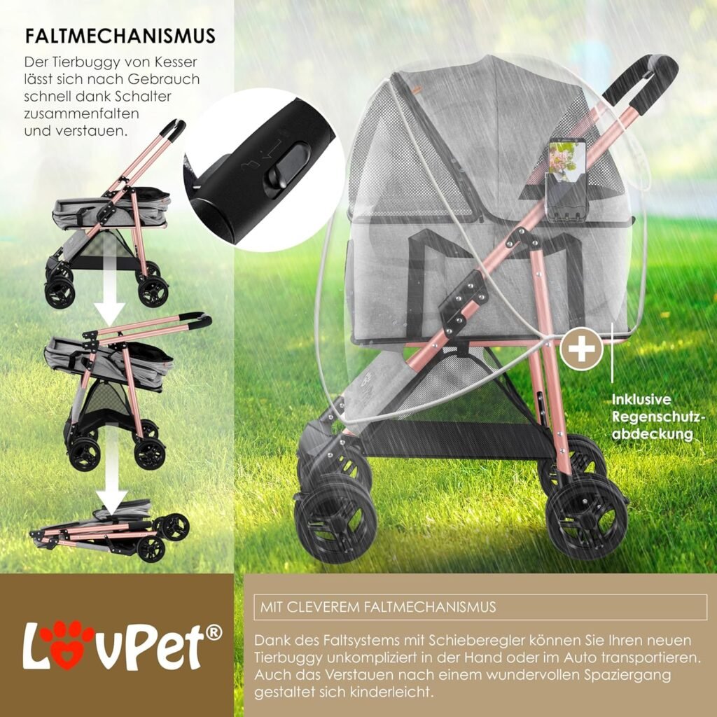 La seguridad también es una prioridad en el diseño del cochecito Lovpet®, lo que se manifiesta en la inclusión de una cubierta para la lluvia. Esta parte del cochecito permite proteger a las mascotas de las inclemencias del tiempo, asegurando que un leve inconveniente no interrumpa una agradable caminata. Asimismo, los frenos en las ruedas traseras ofrecen una estabilidad adicional cuando se necesita detenerse, protegiendo así a la mascota y brindando tranquilidad al propietario. Estas características hacen del cochecito Lovpet® una opción excelente para quienes buscan una manera segura y cómoda de transportar a sus perros durante paseos al aire libre.